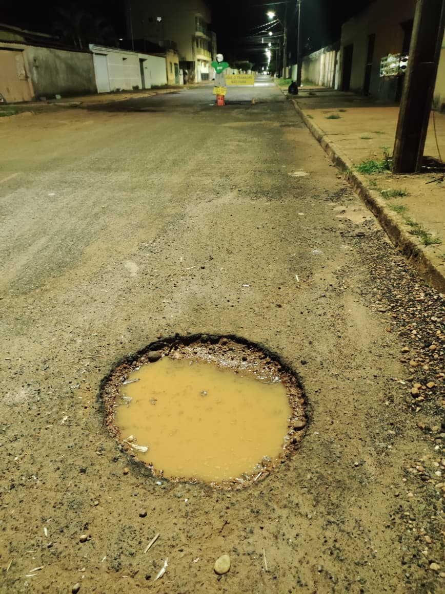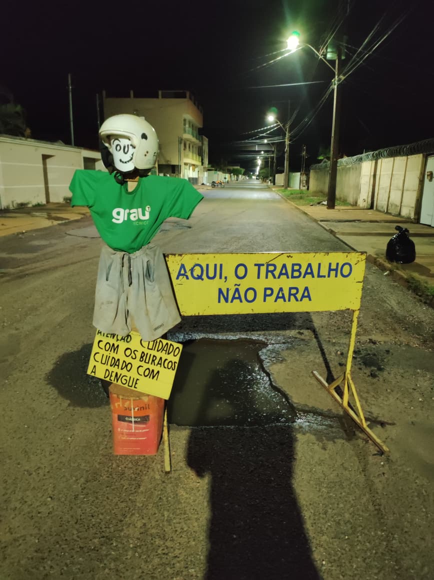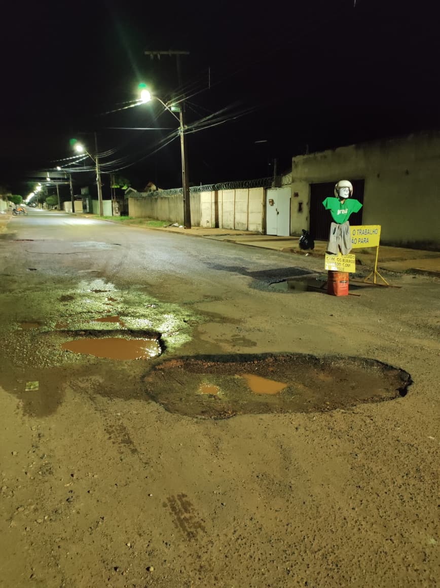 A paciência do morador de Tupaciguara com a buraqueira parece ter chegado ao limite, e o desabafo veio com criatividade e uma boa dose de ironia. Há cerca de duas semanas, a Rua José Primo de Azevedo, no bairro Nova Esperança, ganhou “funcionários” inusitados: manequins feitos de plástico, cabos de vassoura e roupas velhas.