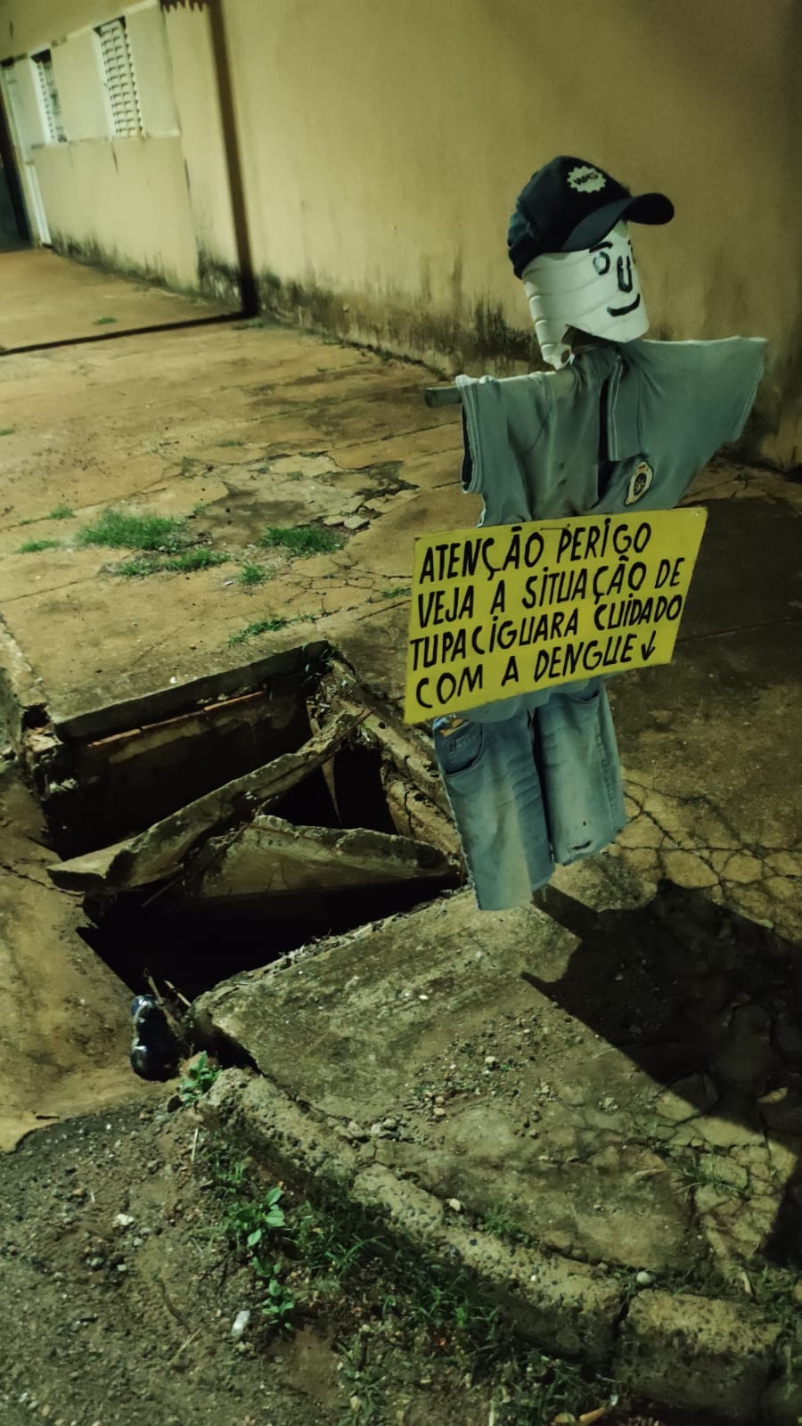 Os bonecos foram instalados pela própria vizinhança para sinalizar o perigo e cobrar o governo. Com placas de “Cuidado com a Dengue” e frases irônicas como “Aqui o trabalho não para”, os moradores deram um rosto humano ao abandono que sofrem diariamente.